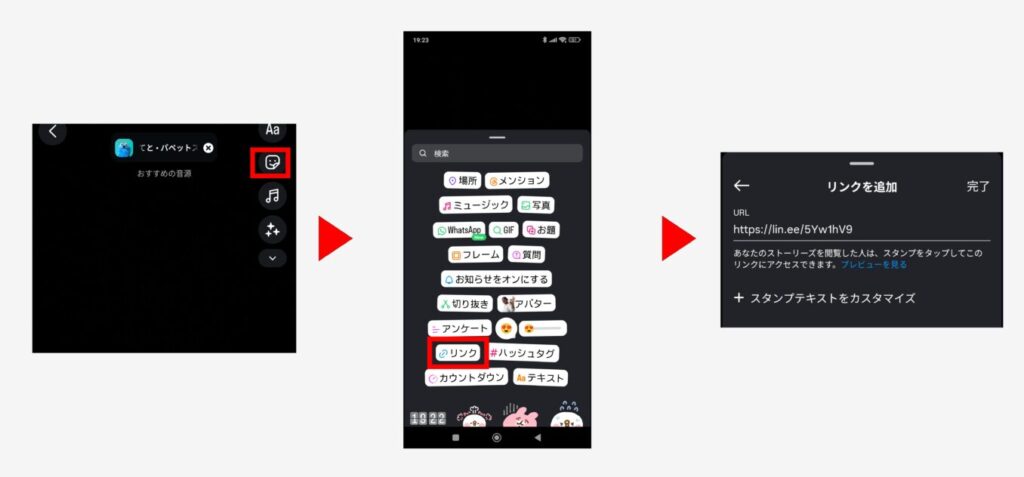 編集画面からスタンプアイコンをタップし「リンク」を選択後、LINE公式アカウントのURLを入力するだけで設置できます。