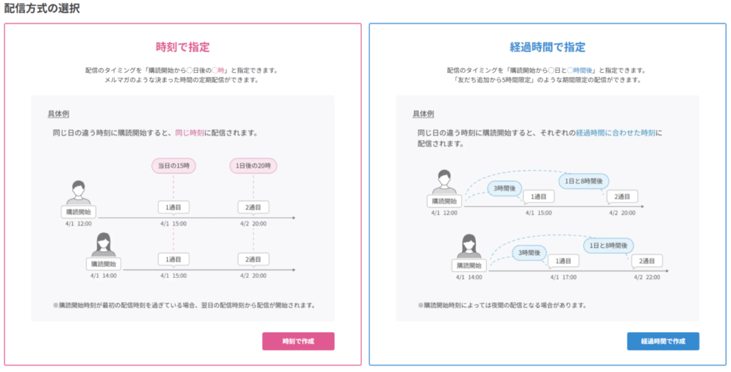 「友だち追加時設定」では、登録直後のユーザーに対する動作を以下2つから自由に設定できます。