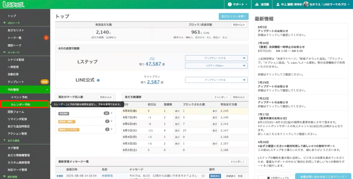 Lステップの「カレンダー予約」機能は、LINE上で予約の受付から管理、リマインドまでを自動化できる非常に強力なシステムです。