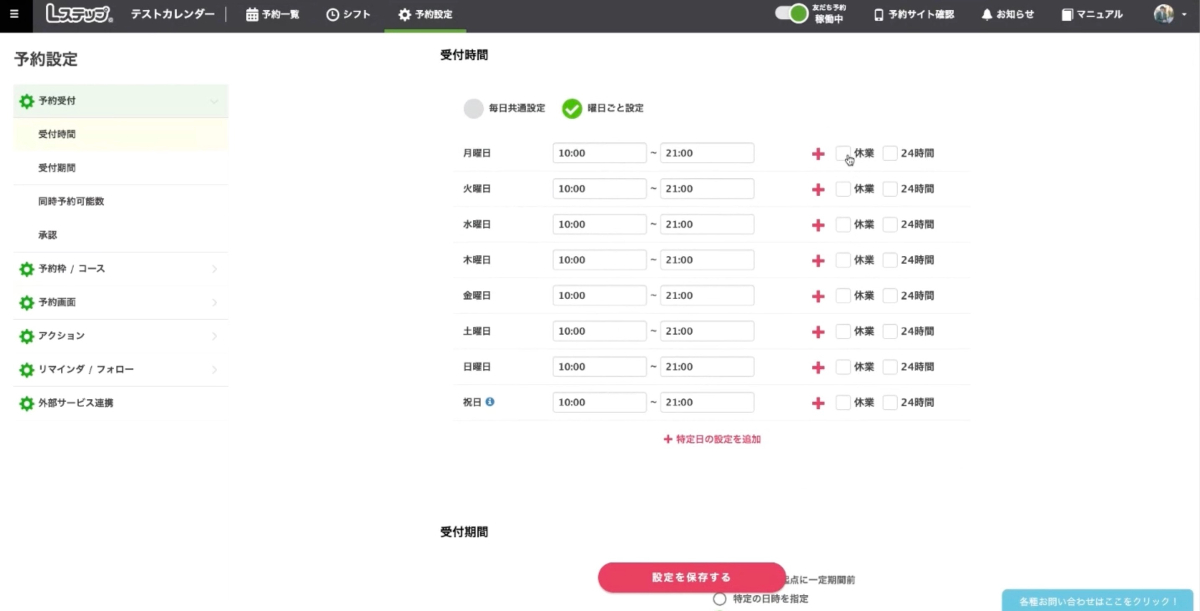 定休日は「特定日の設定」より、「休業」に設定することも可能です。