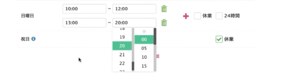 お昼休憩などで中抜けの時間がある場合は、「10:00~12:00」と「13:00~20:00」のように「+」ボタンで時間帯を追加できます。