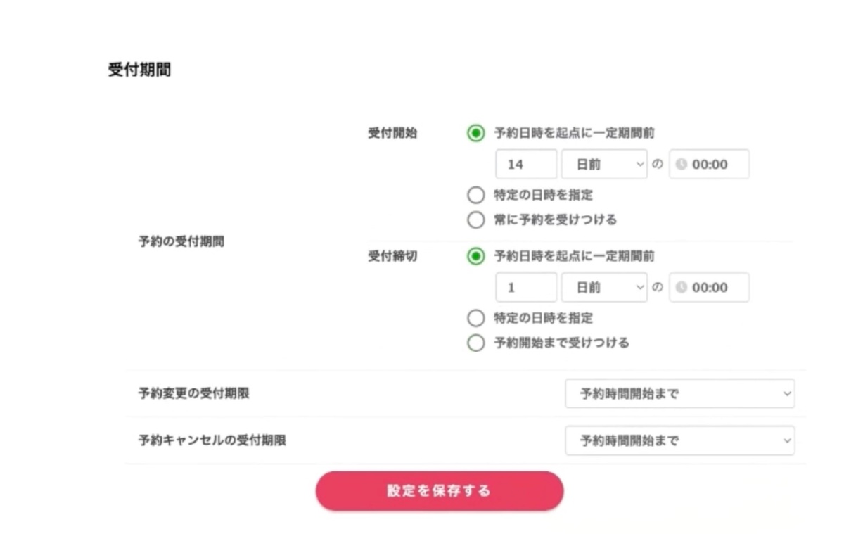 例えば「1日前に締め切る」と設定すれば、当日の急な予約を防ぎ、準備に余裕を持つことができます。