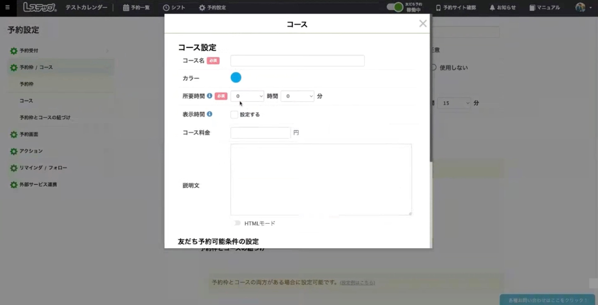 ここで設定した所要時間に基づき、予約カレンダーの空き時間が自動で計算されます。