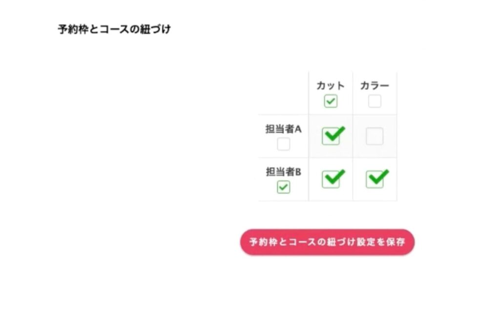 「担当者Aはカットのみ対応可能」「担当者Bはカットとカラー両方に対応可能」といったスキルセットに合わせた設定可能です。
