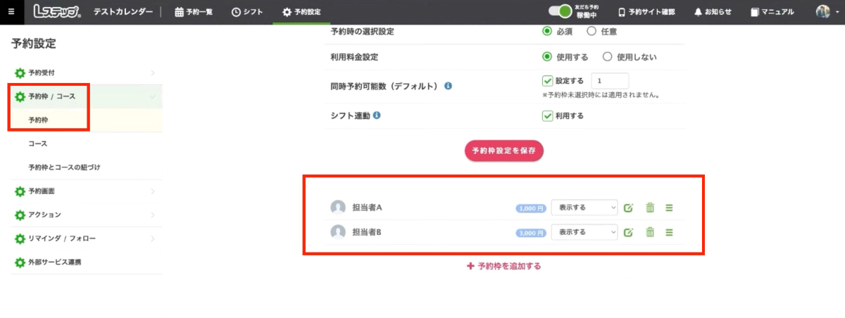 「担当者A」「担当者B」のように作成し、必要であれば指名料もここで設定します。