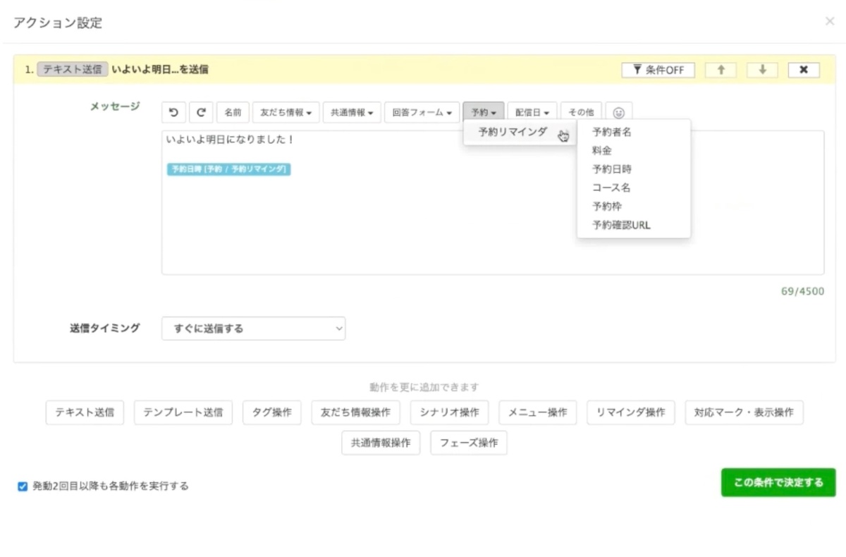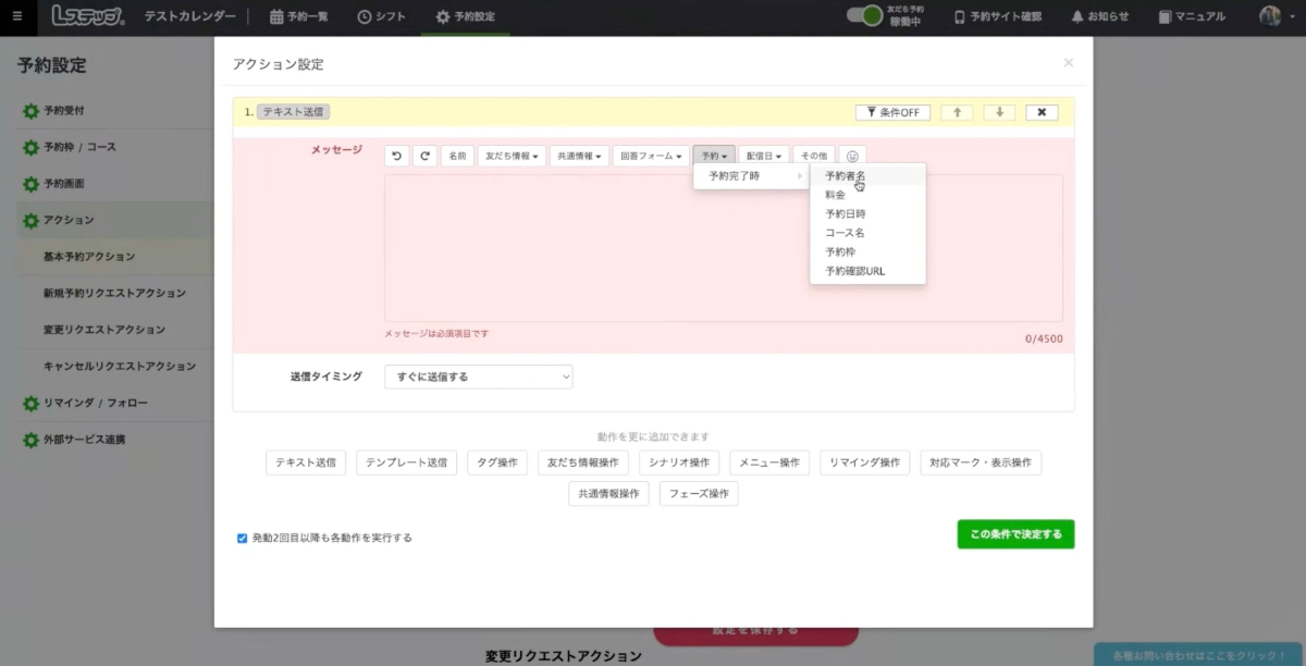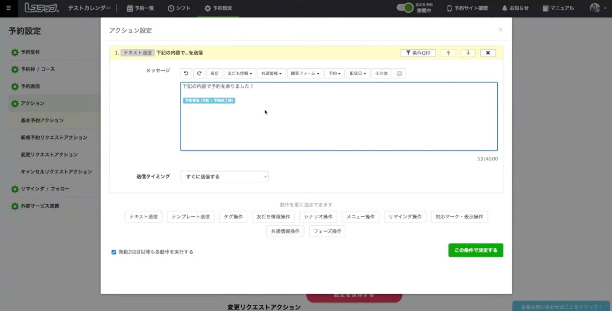 お客様が予約を完了した直後に、システムが自動で行うことを設定します。重要なのは「サンクスメッセージの送信」と「予約完了タグの付与」です。