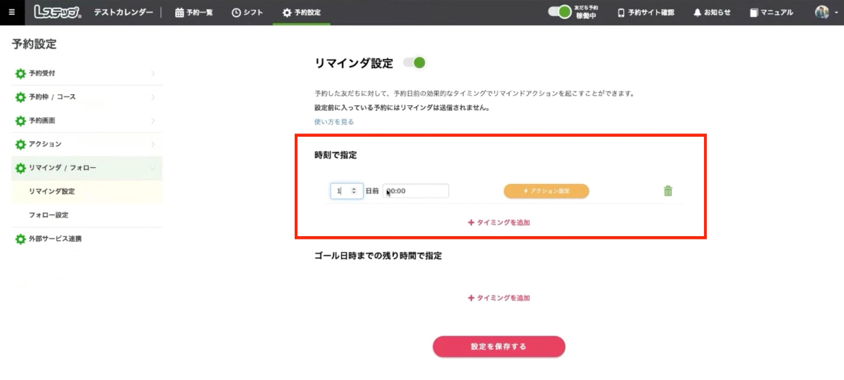 リマインダも設定し、お客様のフォローアップも強化しましょう。「タイミングを追加」で通知数を増やせます。