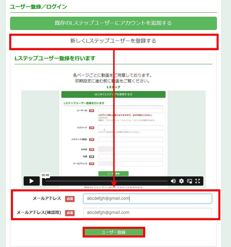 Lステップの登録に利用するメールアドレスを入力し、ユーザー登録をクリックしてください。