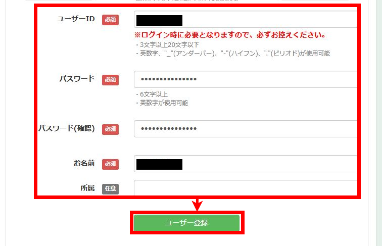情報の入力画面になるので、以下の内容を入力してユーザー登録を押してください。