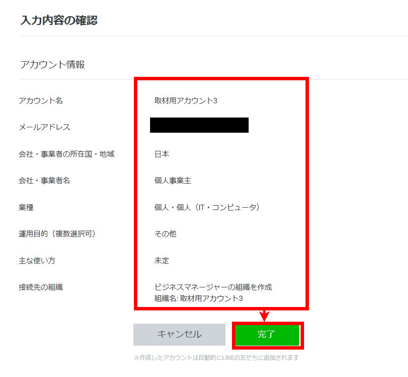 再度確認画面が出るので、内容が正しければ「完了」を押してください。新規のLINE公式アカウントが作成されます。