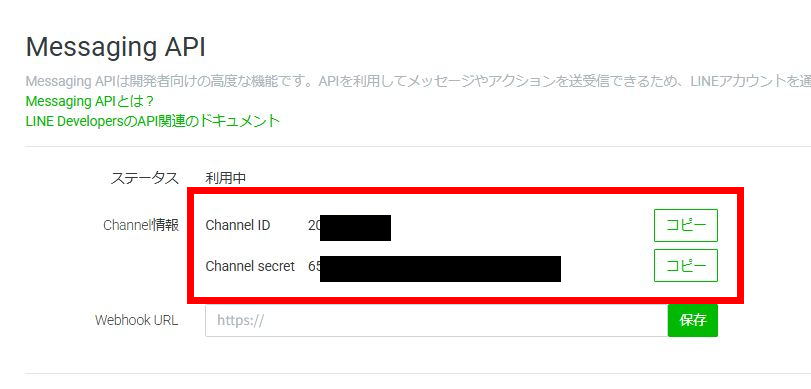 - 「Channel ID」と「Channel Secret」を登録する