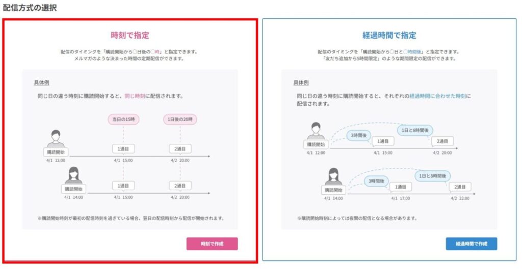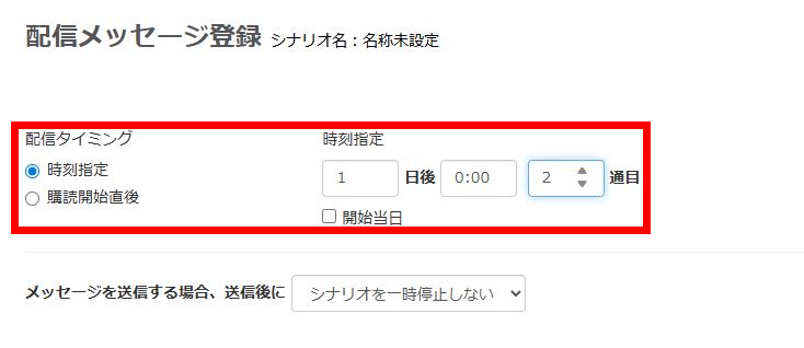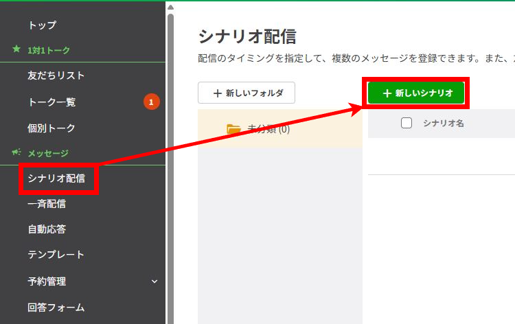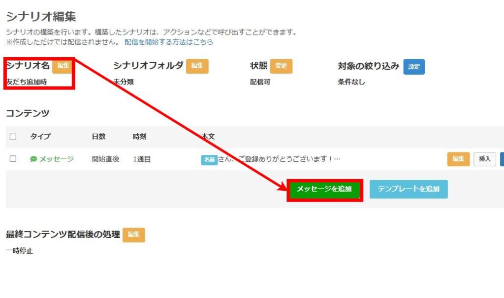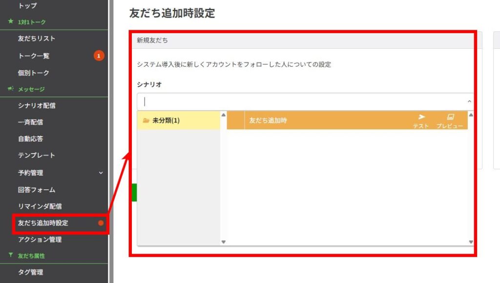 シナリオを配信する際は「友だち追加時設定」から「シナリオ」を選び、新規友だち向けのシナリオを設定してください。