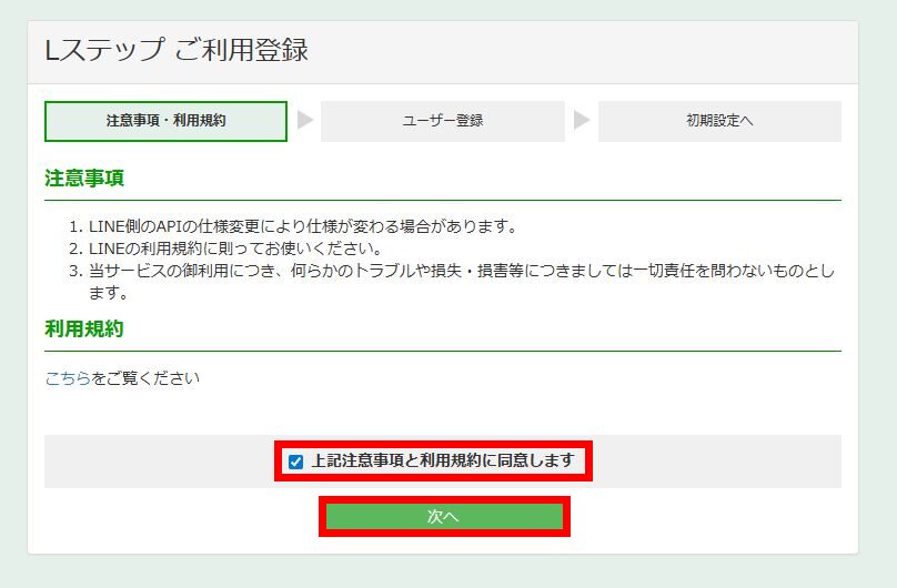 注意事項と利用規約を確認できたら「上記注意事項と利用規約に同意します」にチェックを入れて「次へ」をクリックしてください。