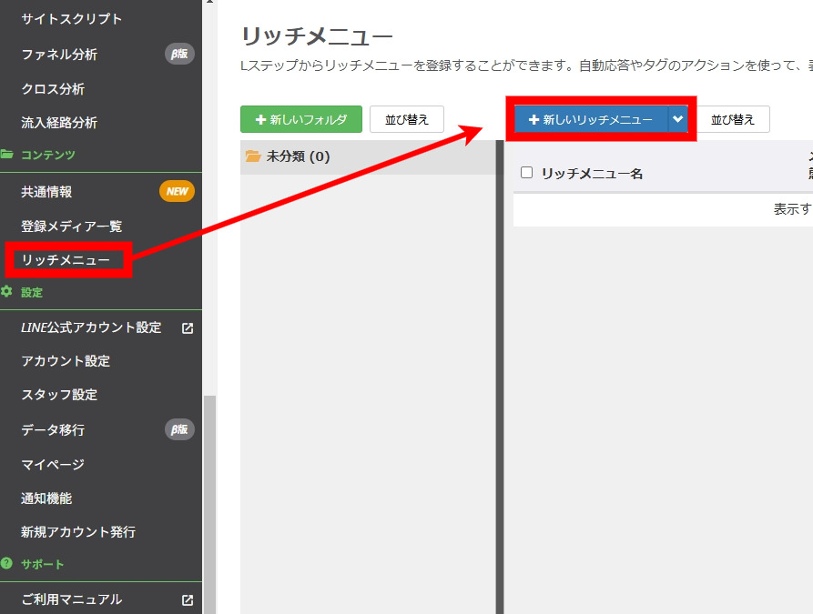 リッチメニューは、サイドメニューの「リッチメニュー」から「+新しいリッチメニュー」を選べば行えます。