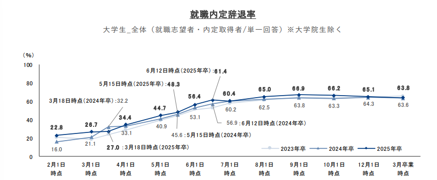 2025年3月に公表された就職みらい研究所の調査では、2025年卒の内定辞退率は63.8%に達しており、実に3人に2人近くが内定を辞退している計算になります。